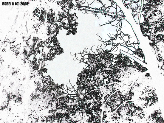 IN: Tree limbs, back dropped by a blue sky filled with cotton swabs of clouds.